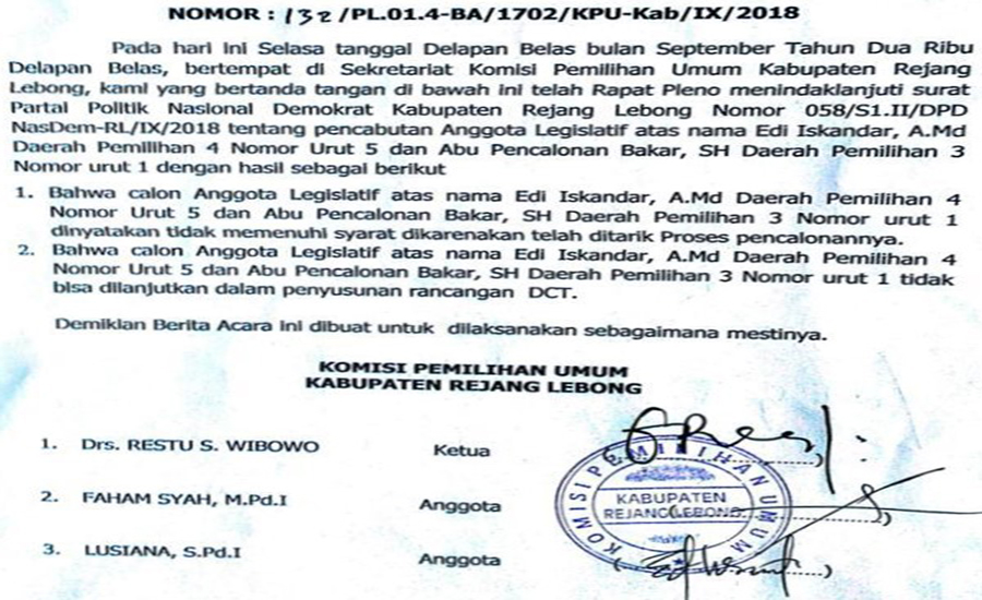 “Kami sudah melayangkan surat pencoretan dan komunikasi intensif ke KPU Rejang Lebong. Ketua KPU Rejang Lebong Restu Windows mengapresiasi langkah NasDem ini dan sudah bersurat ke KPU Provinsi Bengkulu”, kata Willy Aditya, di Jakarta, Jumat (21/9).